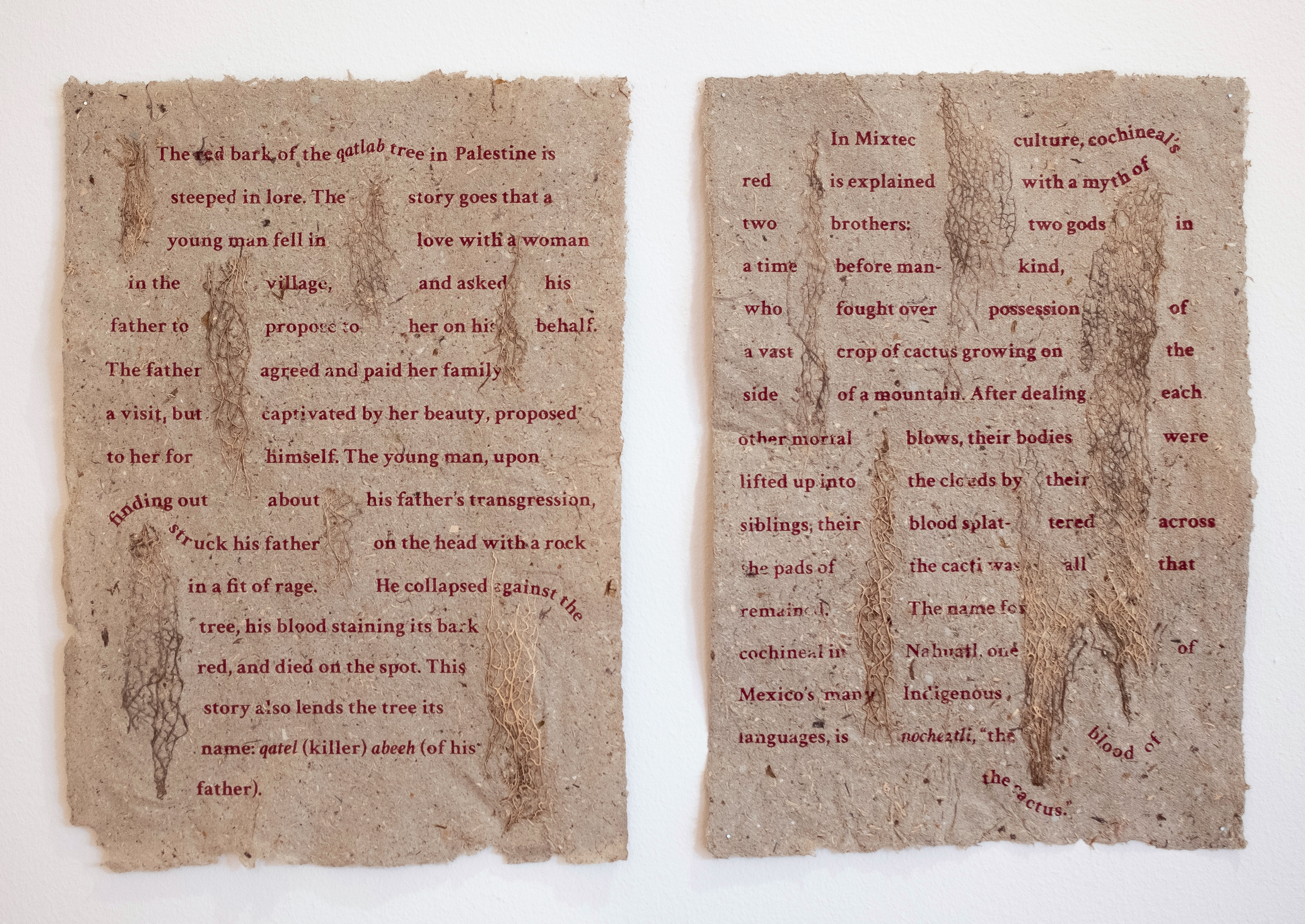 Printed here in ink made from Oaxacan cochineal on paper made from Palestinian prickly pear, these two worlds come into conversation—the blood of the cactus staining its pads once again, this time to carry myths on its beaten fibres that speak to the violence and bloodshed of colonial extraction and dispossession.