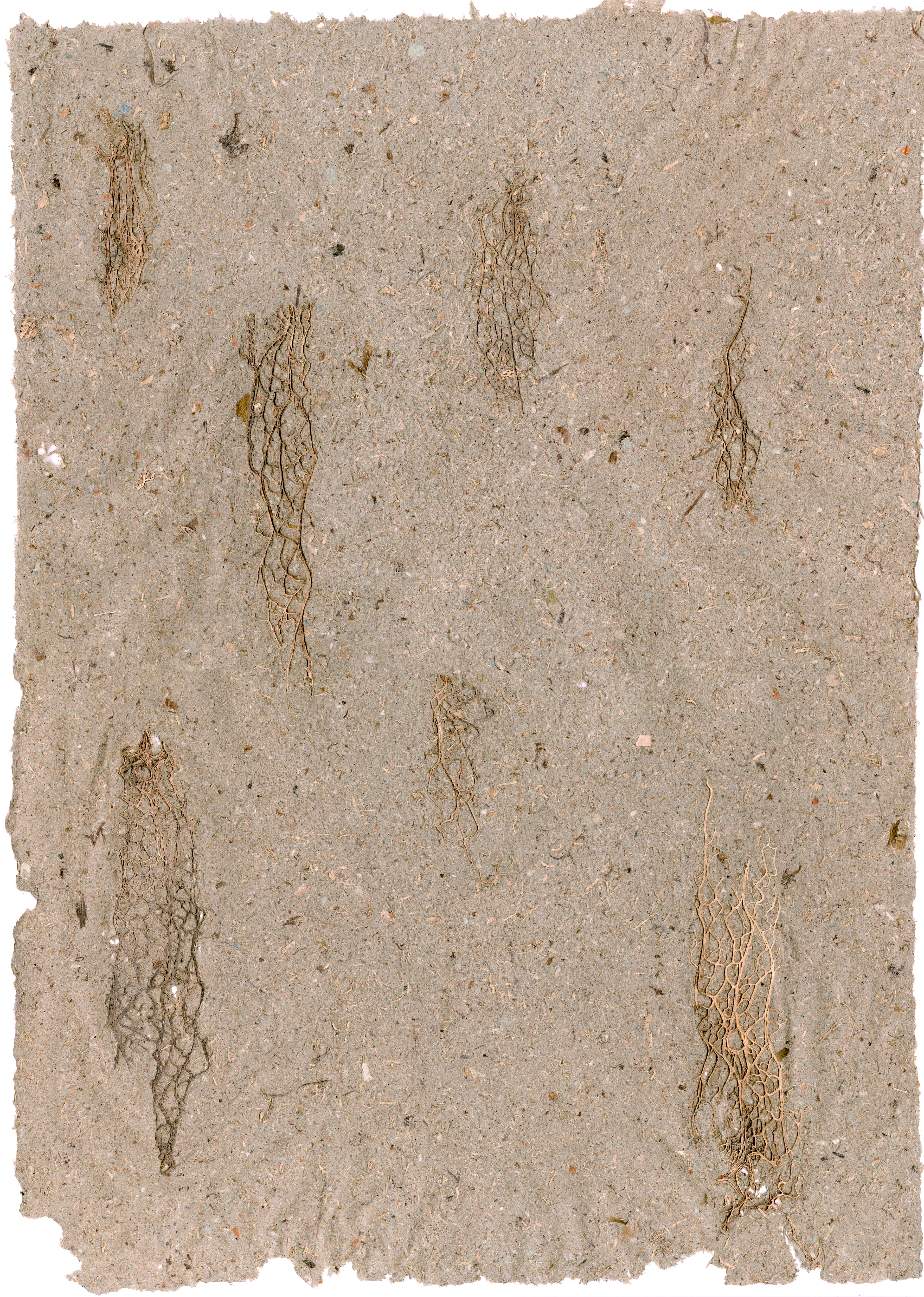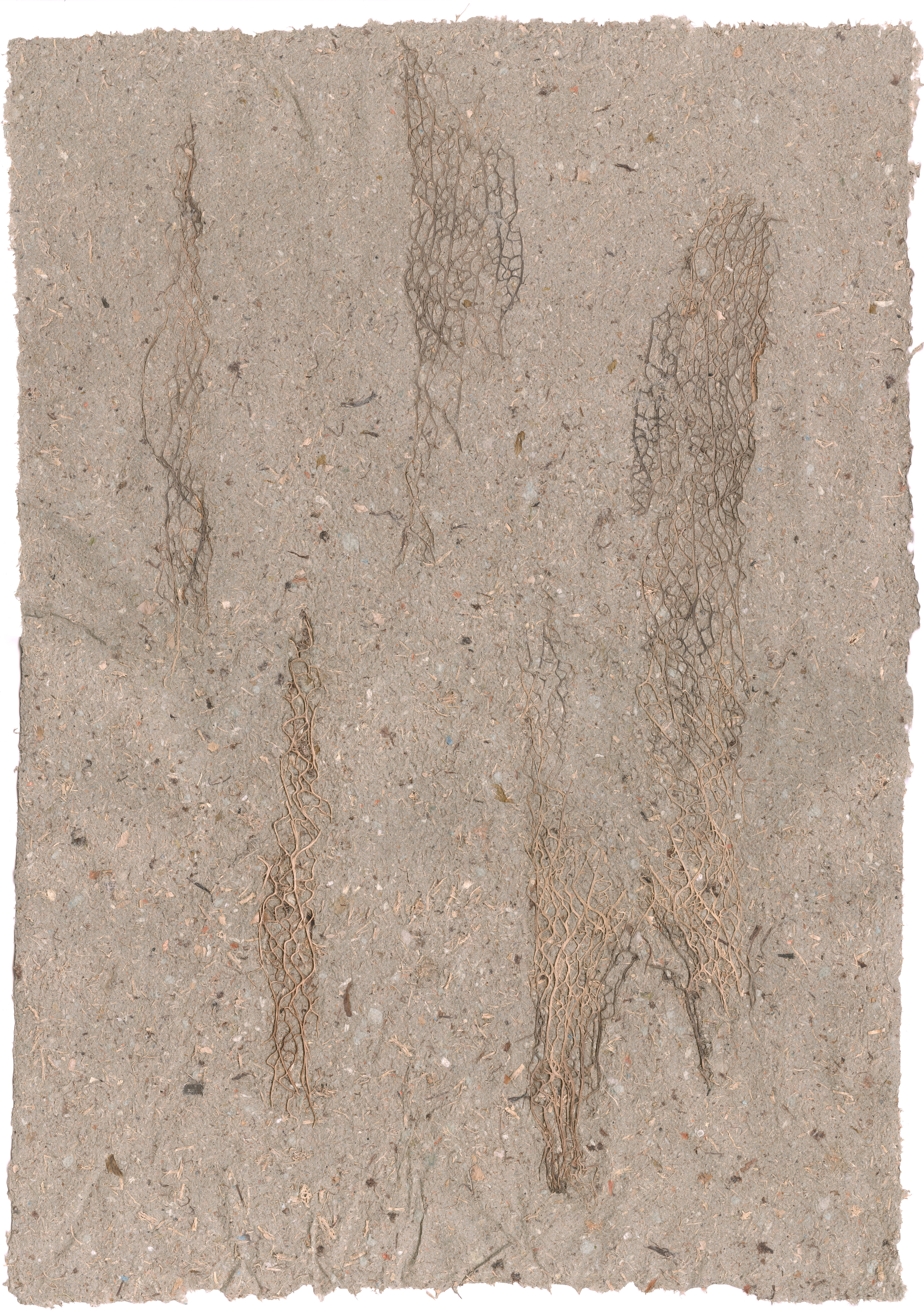 The paper is made from cactus fibres collected in Palestine from prickly pear cacti withering due to the recent spread of the cochineal insect. The fibres were beaten into pulp and also incorporated whole into the sheet design. They were made as part of Al-Wah'at's project Wild Hedges for the work Blood of the Cactus, Blood of the Tree.