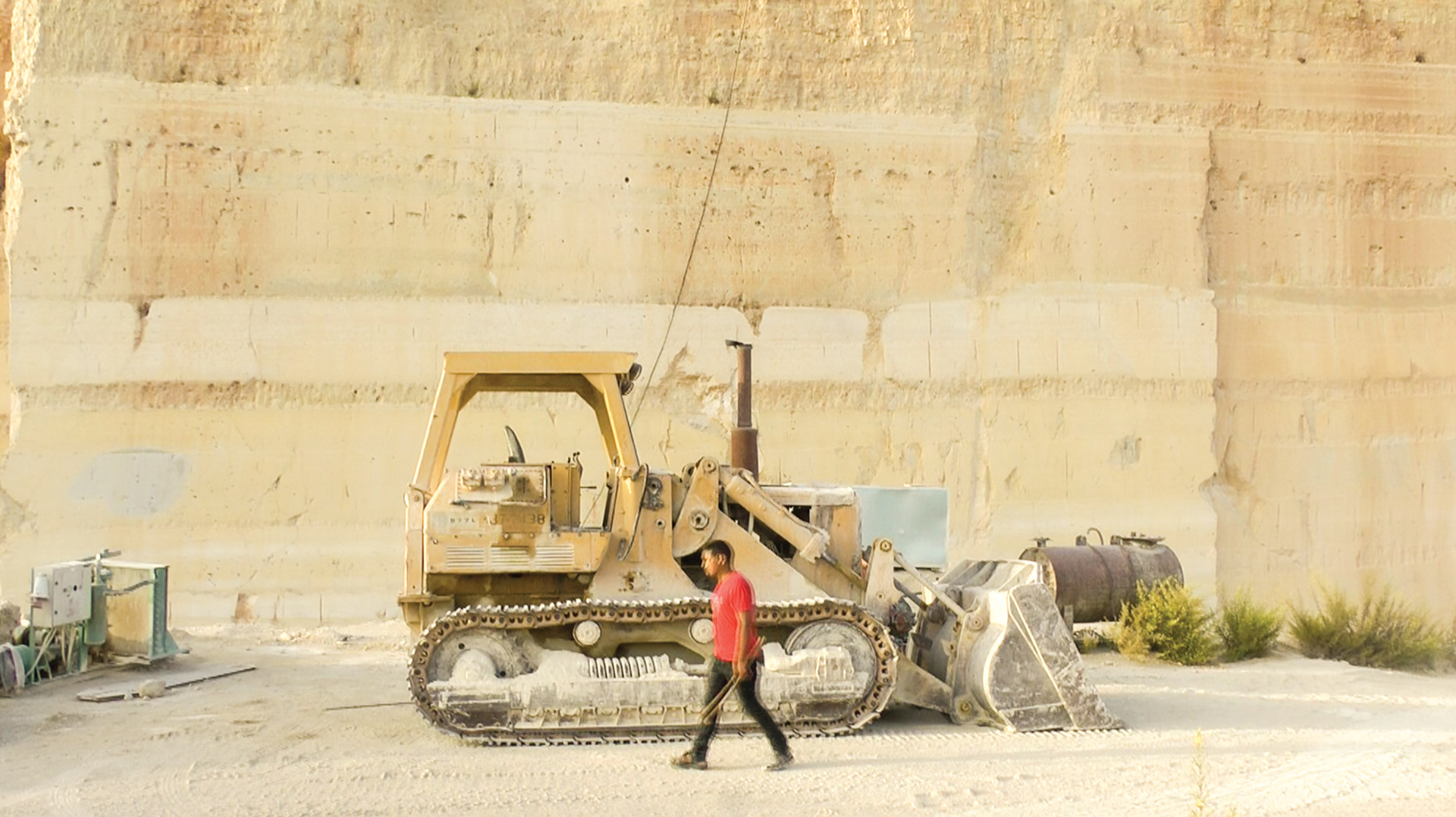 The quarry keeper walks by a bulldozer. Taffuh, Hebron Governate